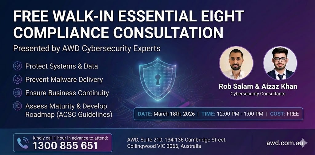 AWD will be conducting an Essential Eight compliance consultation on March 18th, 2026, featuring cybersecurity experts Rob Salam and Aizaz Khan. In this session, they will explore how Australian organisations can implement the ACSC's Essential Eight mitigation strategies to protect their information systems from cyber threats, prevent malware delivery, and ensure business continuity. Learn how...