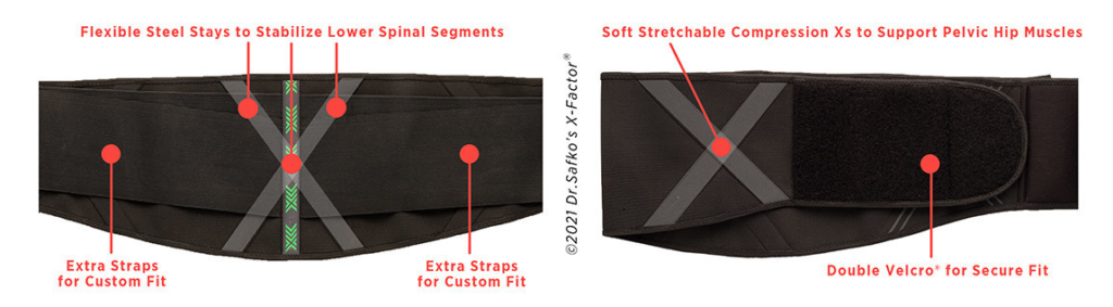 As we age, we all develop a ‘functional scoliosis’, in other words, we tend to favor one side of our body until we eventually create an imbalance in our posture. Most daily activities are done engaging the right side of our bodies, and this is most evident in the pelvic area. The pelvis is the foundation of the spine, where balance, stability, posture and movement are controlled. For Dr. Safko, a US Marine who served in Vietnam, the goal was clear. Most back supports restrict mobility and weaken the core muscles, thus leading to a destabilization of the low back. After much scientific research and reviewing virtually every product on the market, Dr. Safko began to design different prototypes. After four years of research, design and field-testing, Dr. Safko finally arrived at what he calls the ‘X Factor™’.