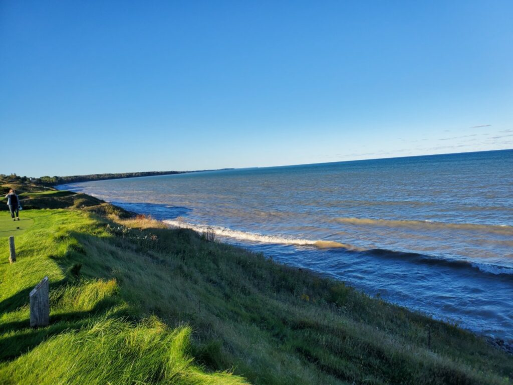 At Whistling Straits, the flying Irish and American flags are at half-mast to honor Herb and a Champions Room chronicles last year’s Ryder Cup. Walk through the clubhouse and the view of the course and ocean beyond is breathtaking. This was also the US Open Champions venue for ‘04, ‘10, and ‘15. A hillside chat by #11 overlooking the Great Lake Michigan was captivating to say the least. 170-210 caddies are employed but not mandatory according to the GM, Mike O’Reilly who started working here in college 26 years ago. 26-27k rounds a year are played here and on the Irish Course behind. Green fees are $250 for the Meadow Valleys and Irish courses, $350 for the River course, and $500 for Straits, plus caddy fees if selected. The season closes October 30, so plan for next year.